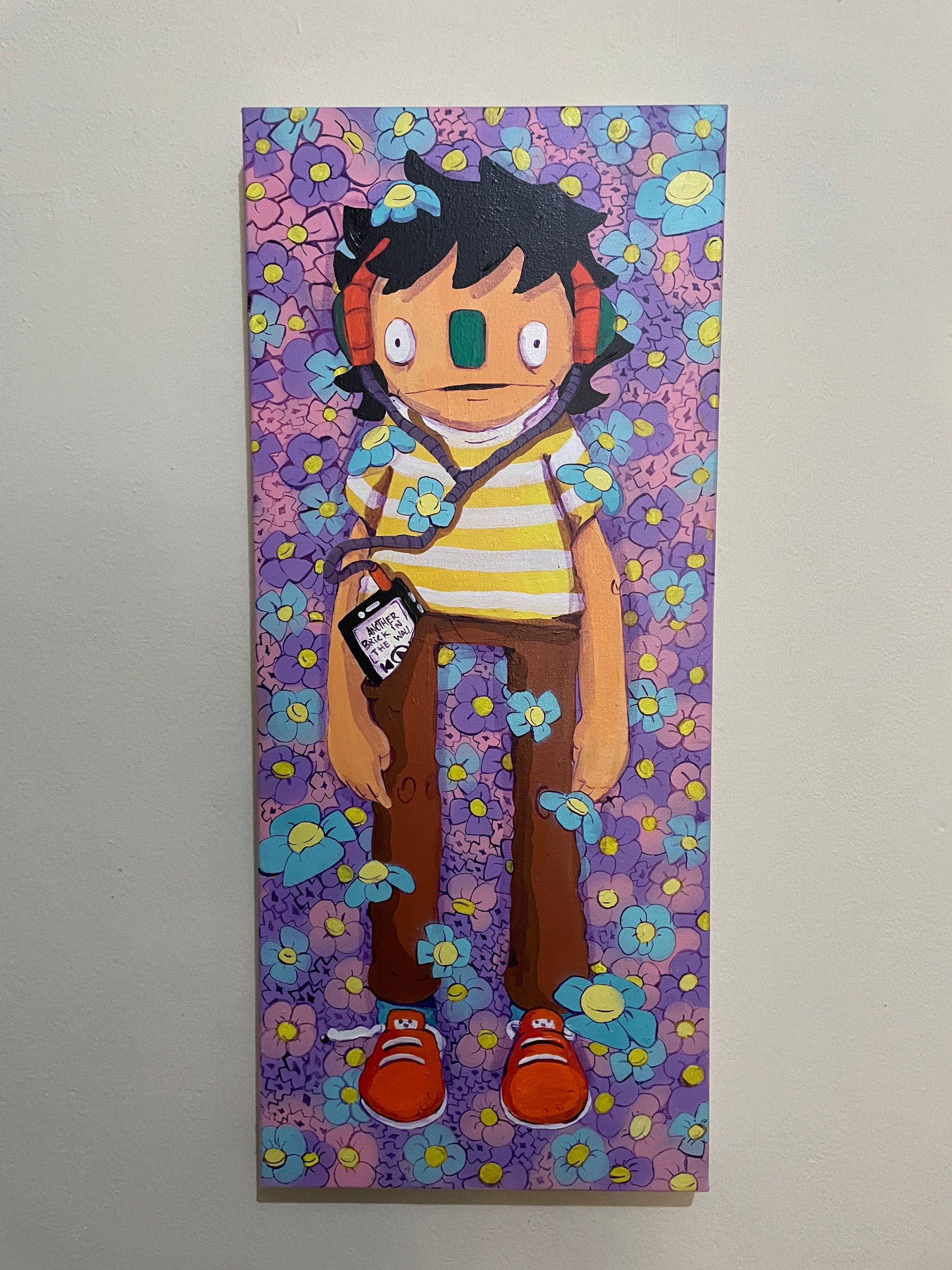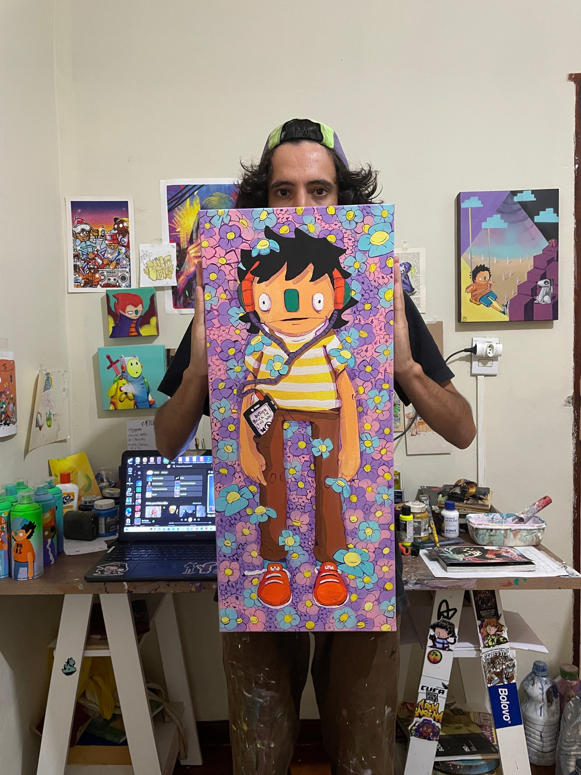 Thiago, known as Meio Killo, was born in 1995 in Embu das Artes. A Graphic Design graduate, his passion for drawing led him to graffiti, which became his main form of expression since 2014. Expanding his art beyond the streets, he works on walls, canvases, and even digital platforms. His art is characterized by iconic faces, featuring reflective eyes and a signature green rectangular nose. With surreal, humorous, and sometimes poetic characters, he creates a playful and thought-provoking universe, turning everyday scenes into moments of reflection and joy.